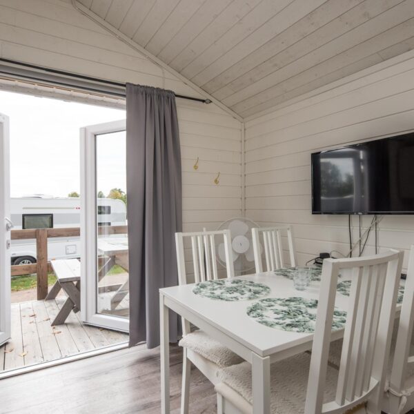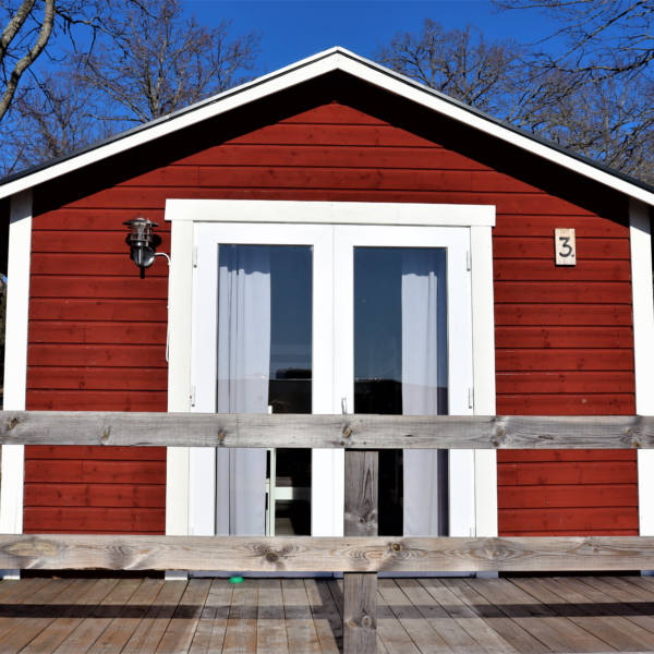 Die vierte Hütte ist 25 m² groß und bietet ebenfalls vier Betten (ein Etagenbett und ein Schlafsofa) und liegt wunderschön am Restaurant und am See. Die Hütte ist mit Küche, Mikrowelle, Wasserkocher, Kühlschrank mit Gefrierfach und TV ausgestattet. Glasfaser ist angeschlossen. Bettlaken und Kissenbezug kannst du für 75 kr/Set an der Rezeption mieten. Lies mehr und buche die größere Hütte hier.